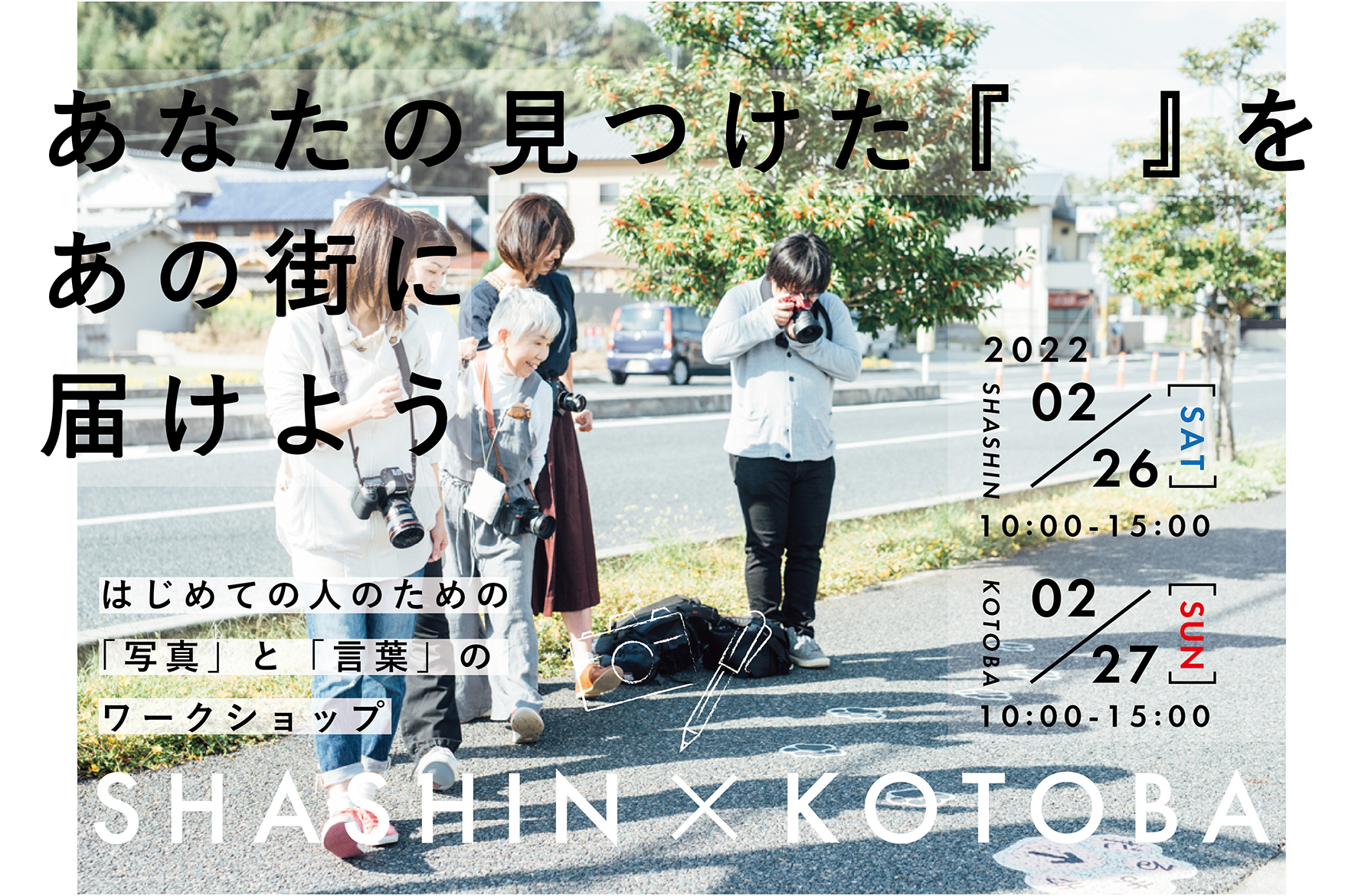 あなたの見つけた『 』をあの街に届けよう あなたの見つけた『 』をあの街に届けよう −初心者向けの「写真」と「言葉」のワークショップ− \参加費無料/ 日 時 📸写真講座「はじめての写真教室」 2月26日(土
